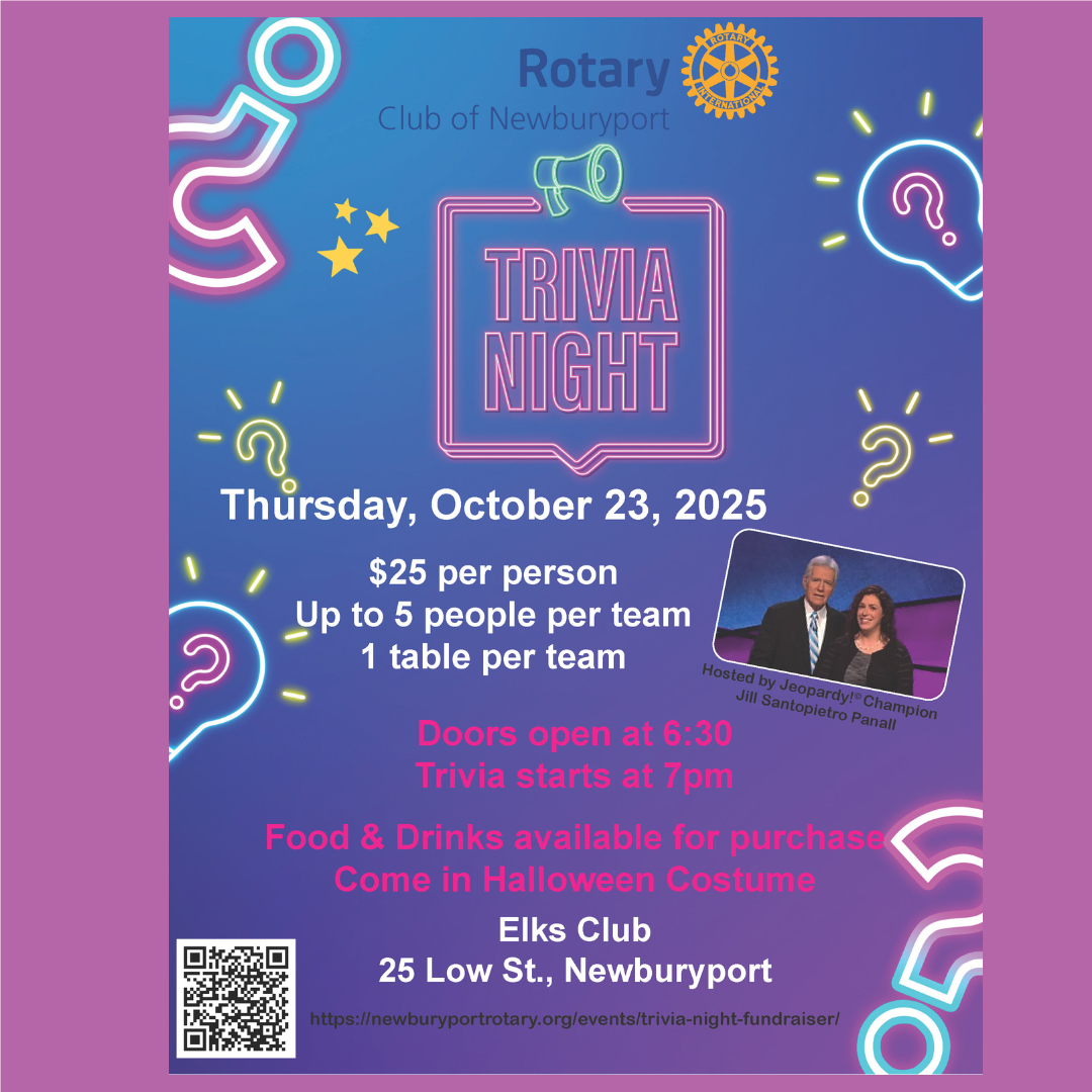 Newburyport Rotary Trivia Night 2021Are you ready for it? Sponsored by ![]() Bring a team of up to five players, or we can create a team for you. Topple last year's smartest team on the seacoast and vie for cash and other prizes! Hosted once again by our local Jeopardy!™ winner Jill Santopietro Panall, the evening promises interesting questions, odd historical facts, and lots of friendly competition! Thursday, November 18, 2021 Food and drink available for purchase. $125.00 per team; up to five people per team. Or $25 to register as a single. Payment page for online registration.